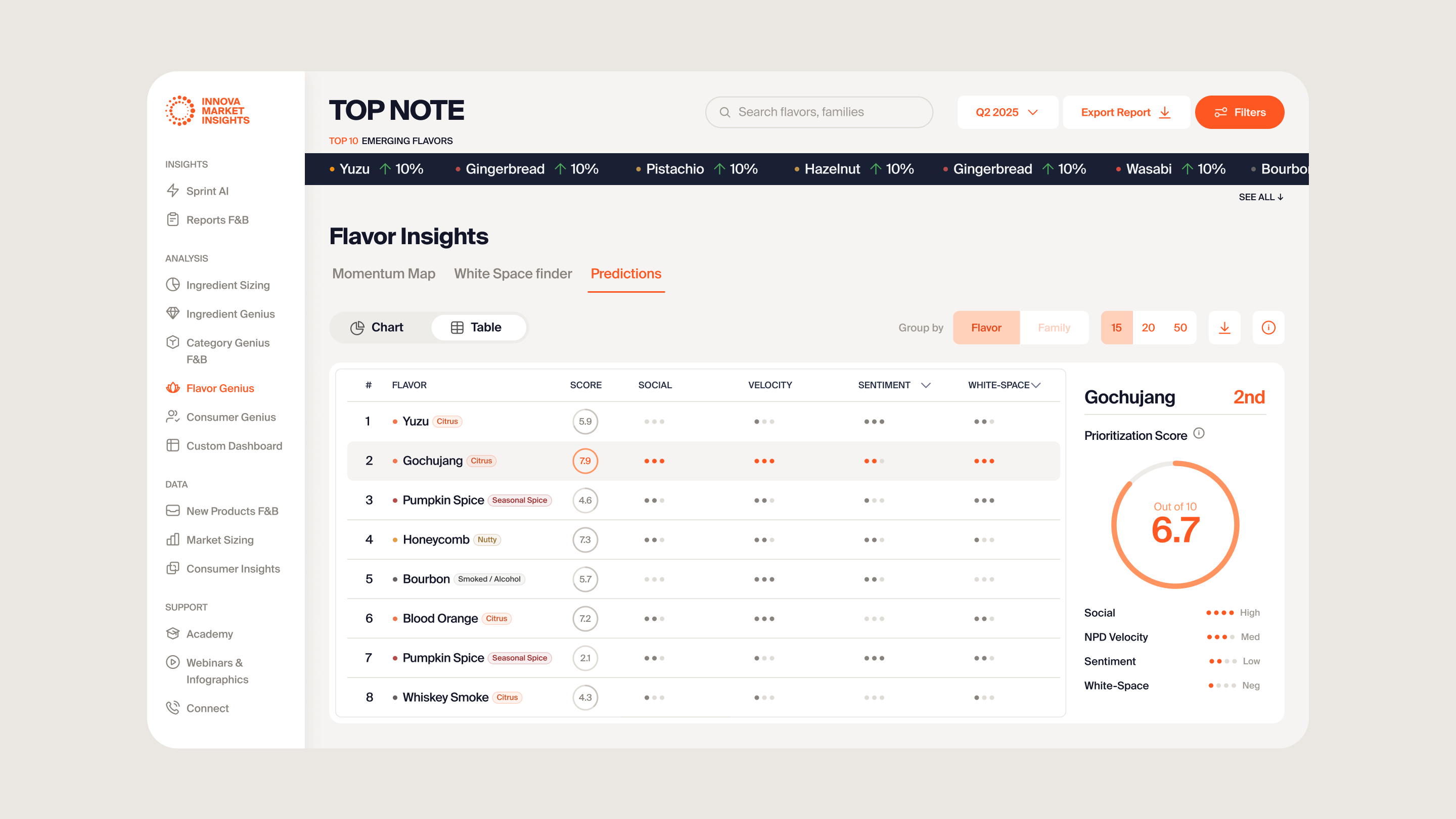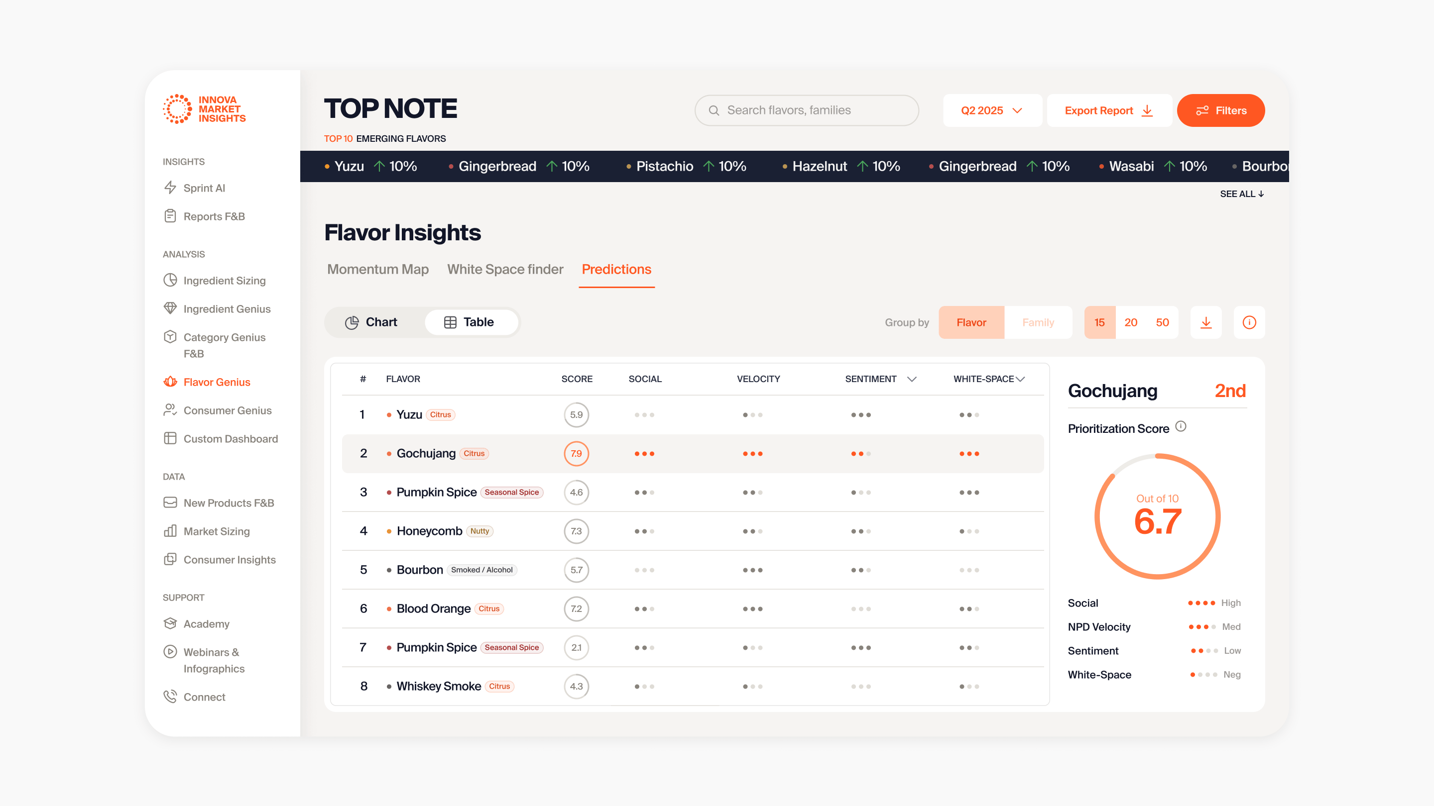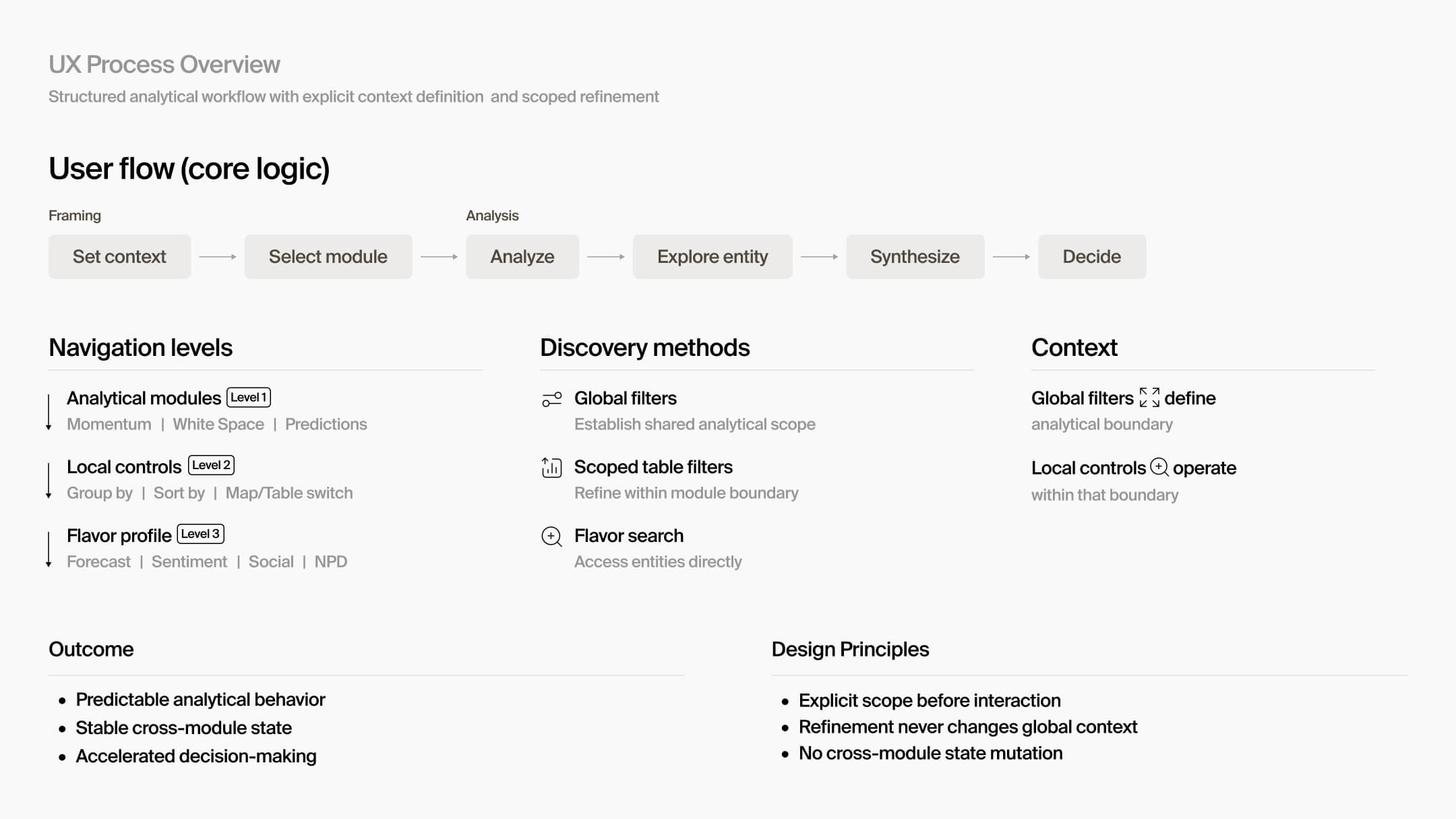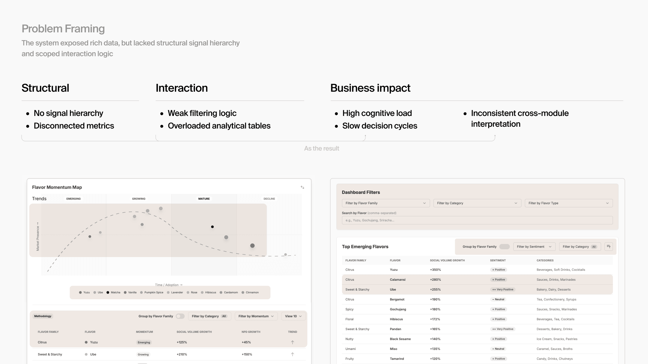 Innova Market Insights is a market intelligence platform used by food and beverage companies to track product launches, ingredients, and consumer trends. The product contained a large amount of structured and unstructured data, but the interface lacked a clear navigation model and decision-oriented hierarchy. As a result, analysts had to manually piece together insights across multiple views. The work focused on restructuring how users move through the system — clarifying navigation, aligning data relationships, and supporting more consistent analysis.